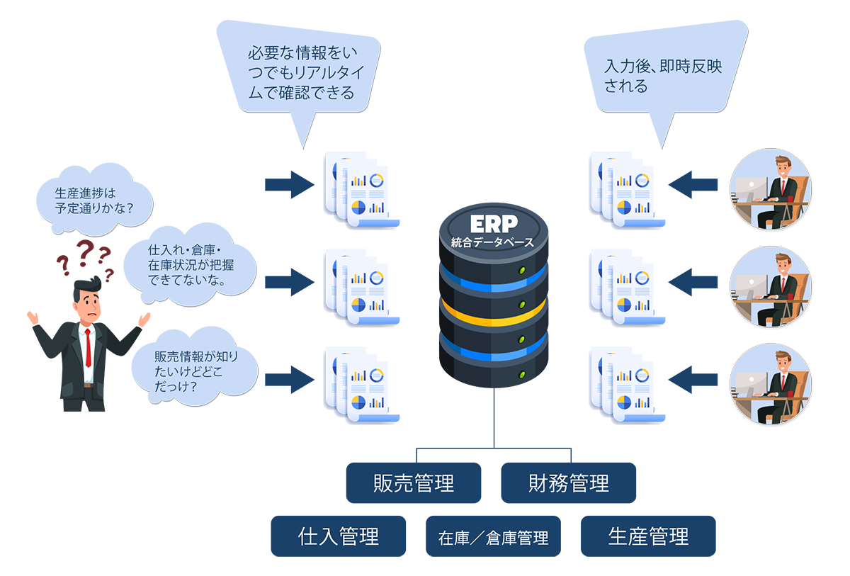 ・各部門・各担当がばらばらに管理していたビジネスデータ(会計・販売・仕入・在庫・生産)を、単一のデータベースに統合管理