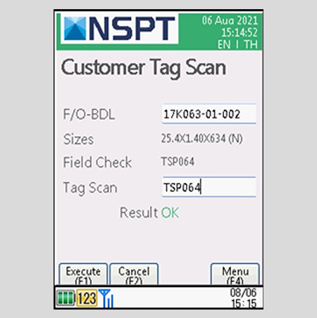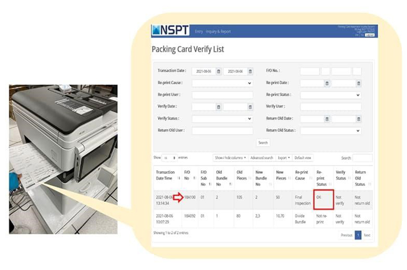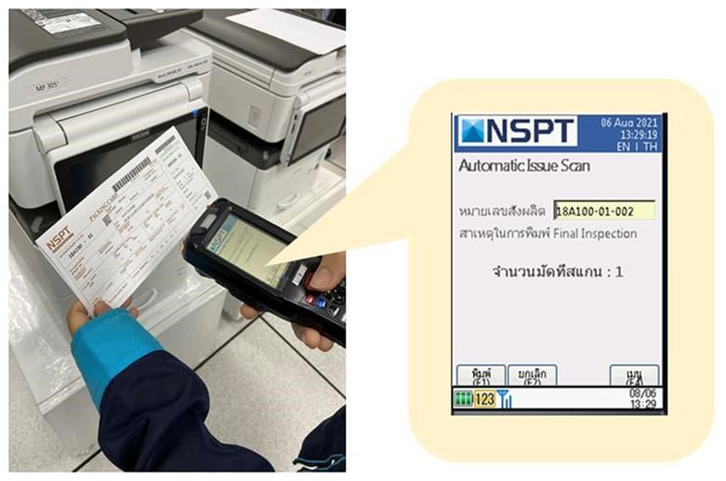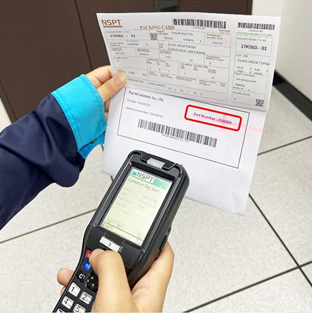 บริษัท NSPT กำลังดำเนินการสร้างระบบควบคุมการผลิตที่ช่วยให้สามารถตรวจสอบย้อนกลับได้ ตั้งแต่การป้อนวัสดุไปจนถึงการจัดส่ง โดยในช่วงไม่กี่ปีที่ผ่านมานี้ ความต้องการในการติดแท็กคำสั่ง (แท็กสินค้าจริง) จากผู้บริโภคมีจำนวนเพิ่มมากขึ้น อย่างไรก็ตามแท็กดังกล่าวเป็นแท็กคำสั่งซึ่งไม่เกี่ยวข้องกับระบบควบคุมการผลิต จึงมีความเสี่ยงในการจะส่งวัสดุที่แตกต่างจากคำสั่ง เนื่องจากความผิดพลาดของมนุษย์ในขั้นตอนการติดแท็ก (เช่น การตรวจสอบด้วยสายตาและการตรวจสอบซ้ำผิดพลาด) ดังนั้น เพื่อเป็นการแก้ไขปัญหาดังกล่าว เราจึงสร้างระบบการตรวจเทียบที่ใช้เครื่องอ่านบาร์โค้ดแบบพกพา หรือ Barcode Handy Terminal (BHT) ขึ้นมา
