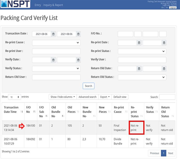 ▲ เมื่อคุณสแกนแท็กของผลิตภัณฑ์แบบเก่า แท็กผลิตภัณฑ์ใหม่จะพิมพ์ออกมาโดยอัตโนมัติ และหมายเลข FO ของแท็กผลิตภัณฑ์แบบเก่าจะปรากฏขึ้น